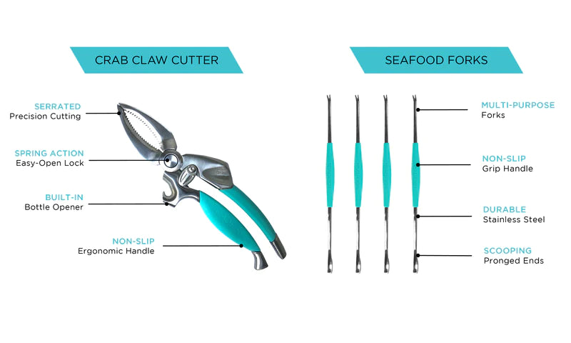- 4x Seafood Forks - A multi-use fork with a scoop on one end and a fork on the other, allowing you to pull out those hard-to-reach pieces of delicious meat with ease.