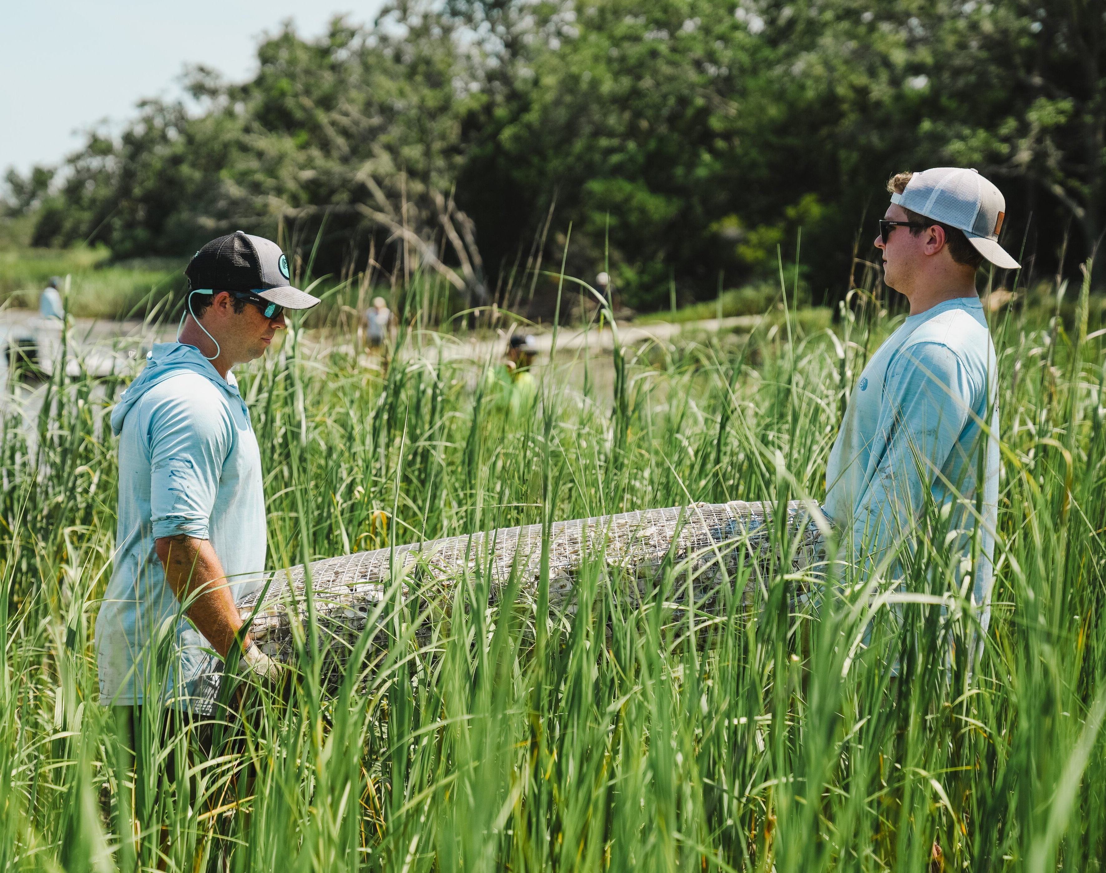 Teamed up with Matt Albers of Rink2Reef to support an Oak Island restoration project where their team is using artificial reefs made from recycled hockey sticks to foster new reef development. These innovative structures provide habitats for oysters and other filter-feeding organisms, enhancing water quality and promoting marine biodiversity. By repurposing broken hockey sticks, Rink2Reef not only reduces waste but also contributes to the restoration of vital coastal ecosystems.